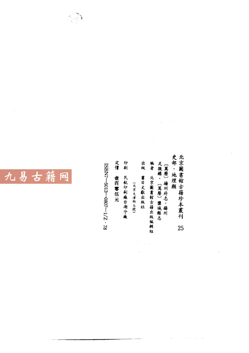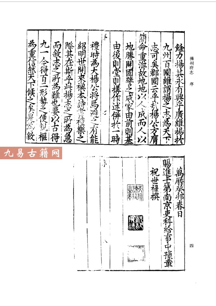 万历扬州府志:成书于明万历三十三年(1605年),由知府杨洵主持修纂。此为明代扬州方志的代表,内容涵盖地理、赋役、官政、人物、文教等,体例承袭前志并增补明代中后期地方实况,尤重漕运、盐政与水利记载,反映江淮经济重心地位。类型属典型的明代综合性地方志。