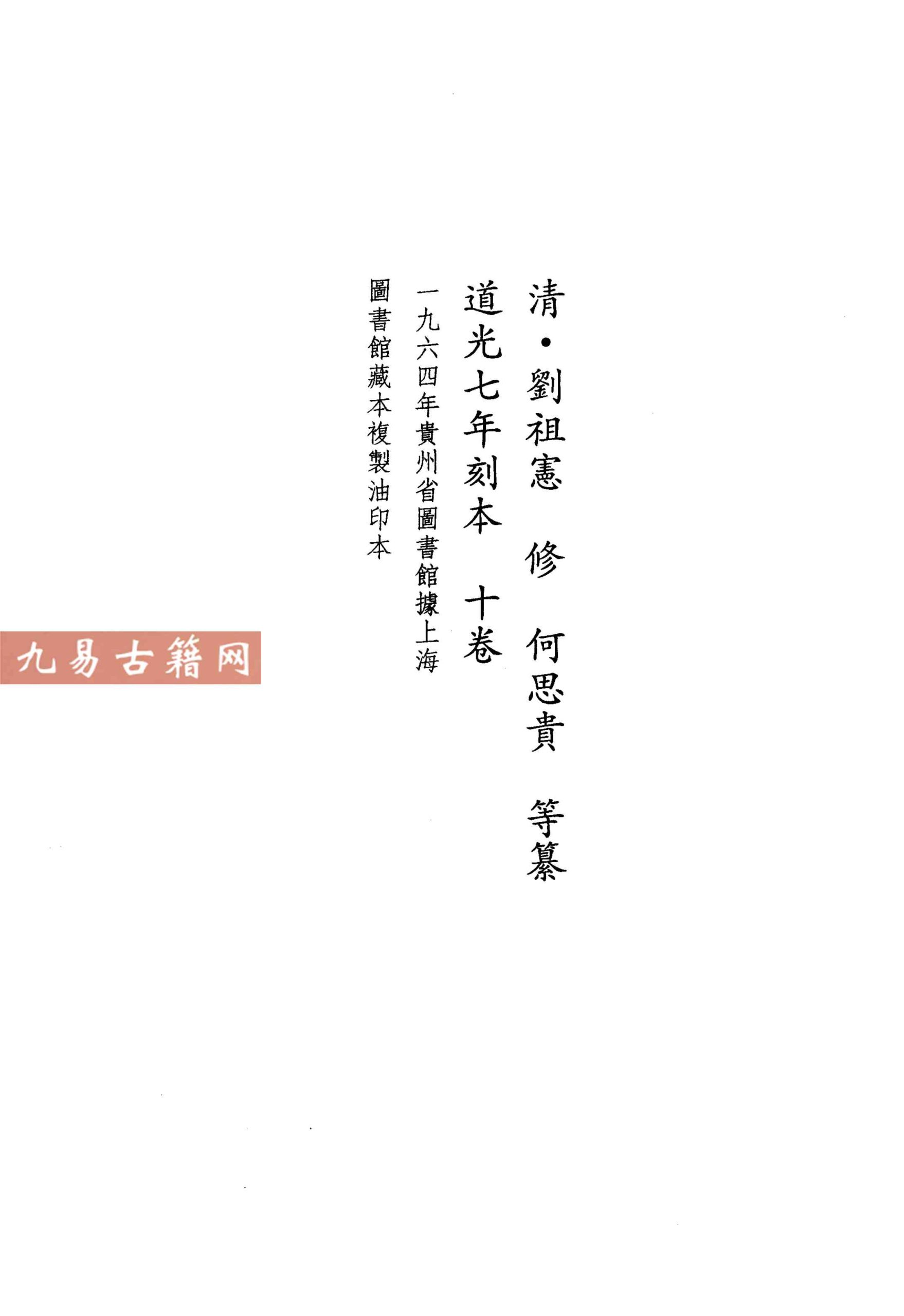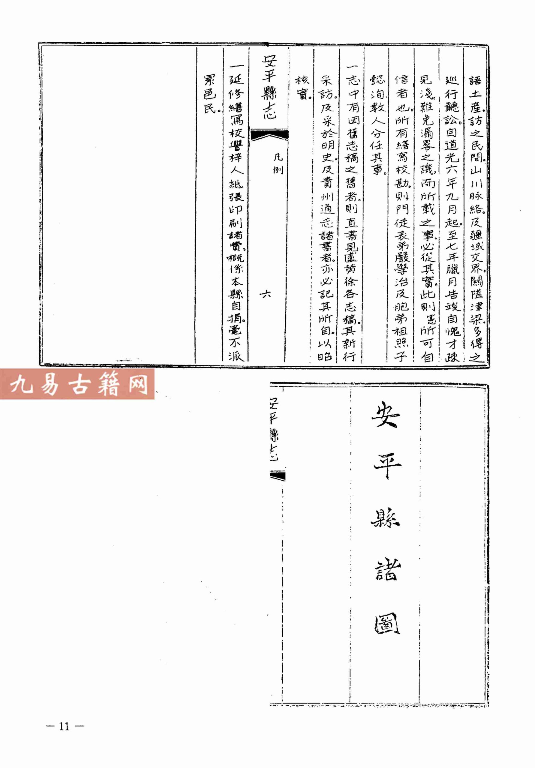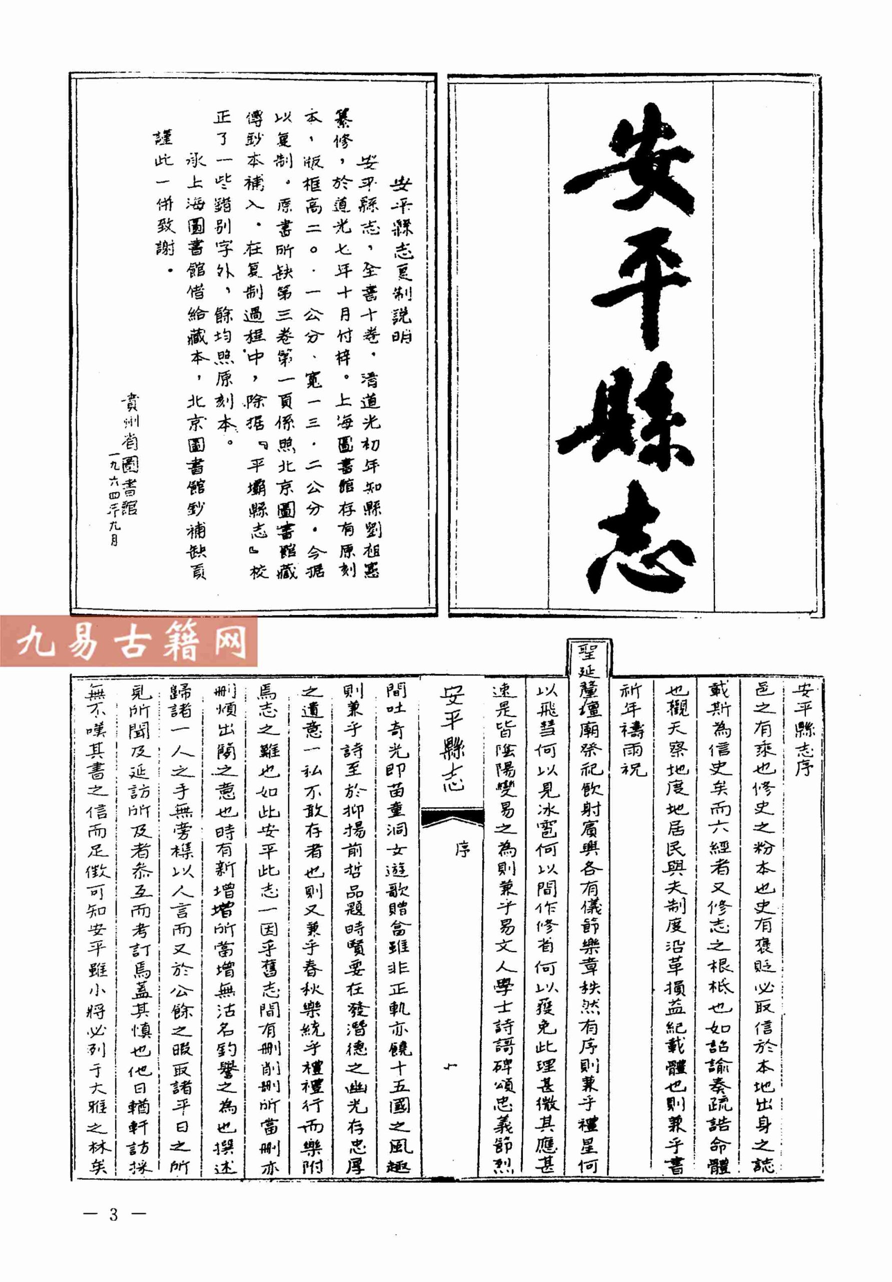 《道光安平县志》是清代贵州省安平县(今平坝区)的一部地方志。成书于清道光七年(1827年),由刘祖宪等纂修。该书特征为体例严谨、记述详实,内容涵盖建置、疆域、山川、田赋、官师、人物、艺文等门类,系统保存了当地清代中叶的政治、经济与文化史料。类型上属于传统地方志中的县级志书,其版本主要为木刻刊本,现存版本具有一定的文献稀缺性。全志集中体现了清代方志学“资治、存史、教化”的编修理念,是研究黔中地区历史地理的重要文献。