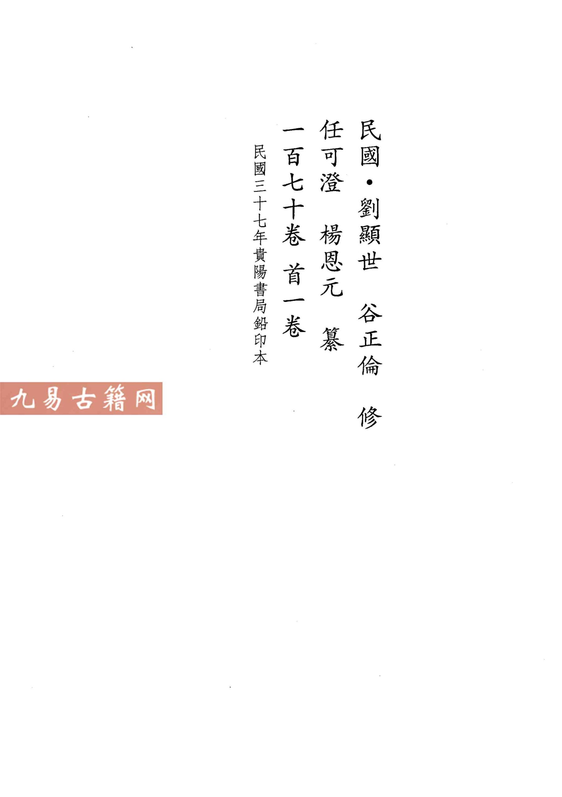 该志由任可澄、杨恩元等人总纂,于民国八年(1919年)倡议修纂,因政局动荡断续进行,最终于民国三十七年(1948年)由贵阳文通书局以铅印本出版。全书共一百七十一卷(含首一卷),装订为一百零五册,近八百万字。内容上溯远古,下迄辛亥革命,设有舆地、建置、前事、食货、职官、学校、人物、艺文、土司等十九个分志,涵盖贵州自然、政治、经济、文化、民族等各方面。